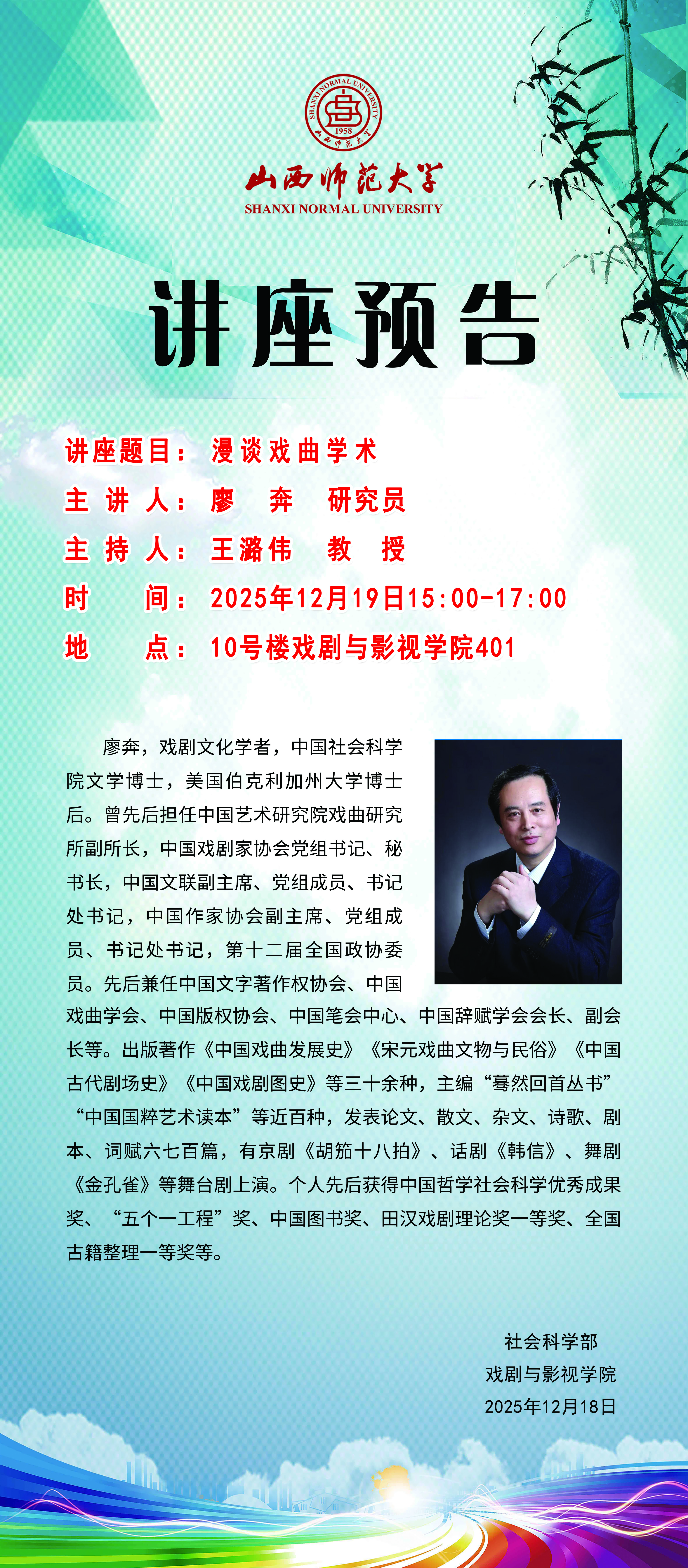 我院拟于12月19日(周五)下午15:00-17:00在南区10号楼401会议室举办《漫谈戏曲艺术》讲座,主讲人为廖奔研究员,本次讲座由王潞伟教授主持。