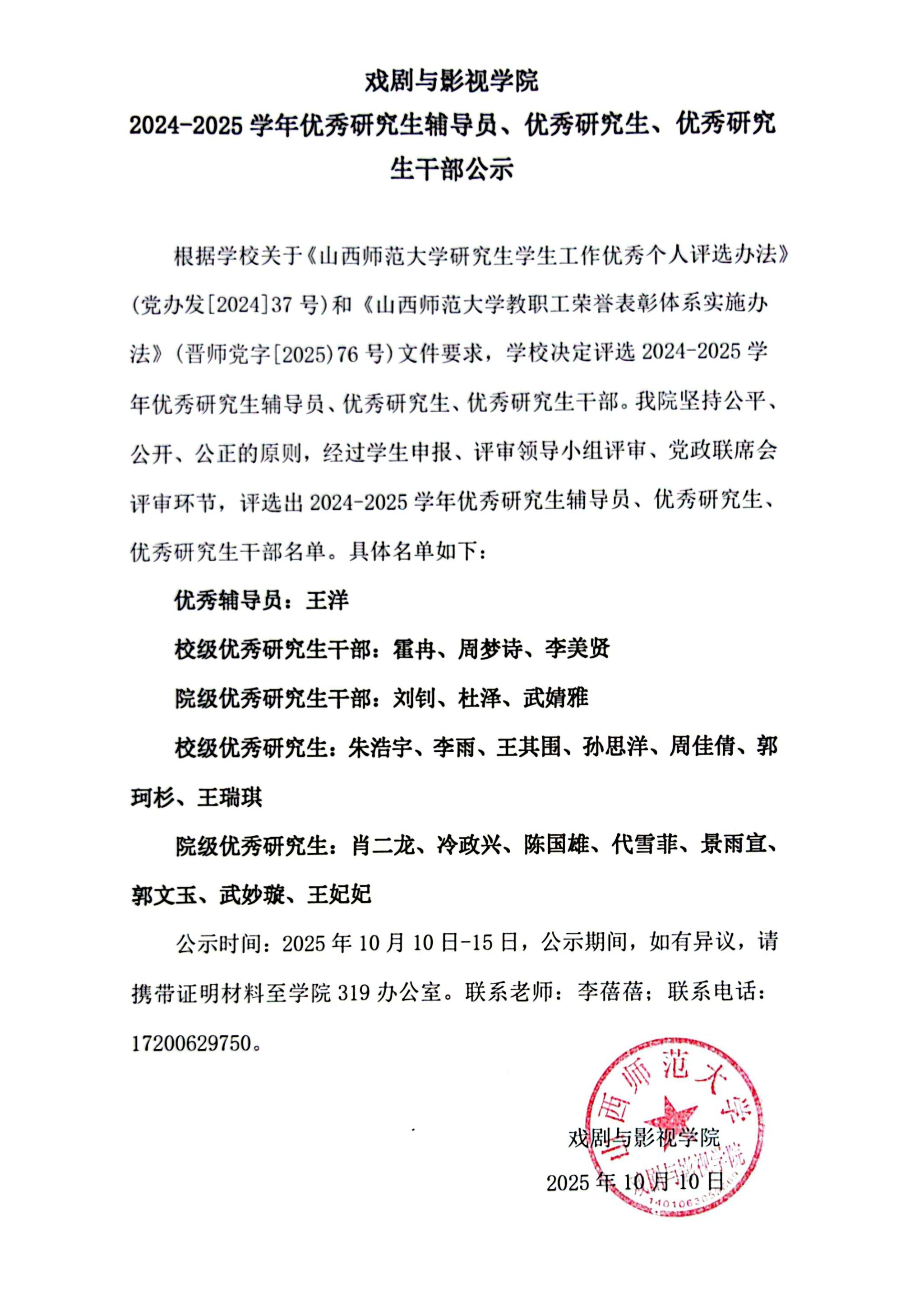 2024-2025学年优秀研究生辅导员、优秀研究生、优秀研究生干部公示