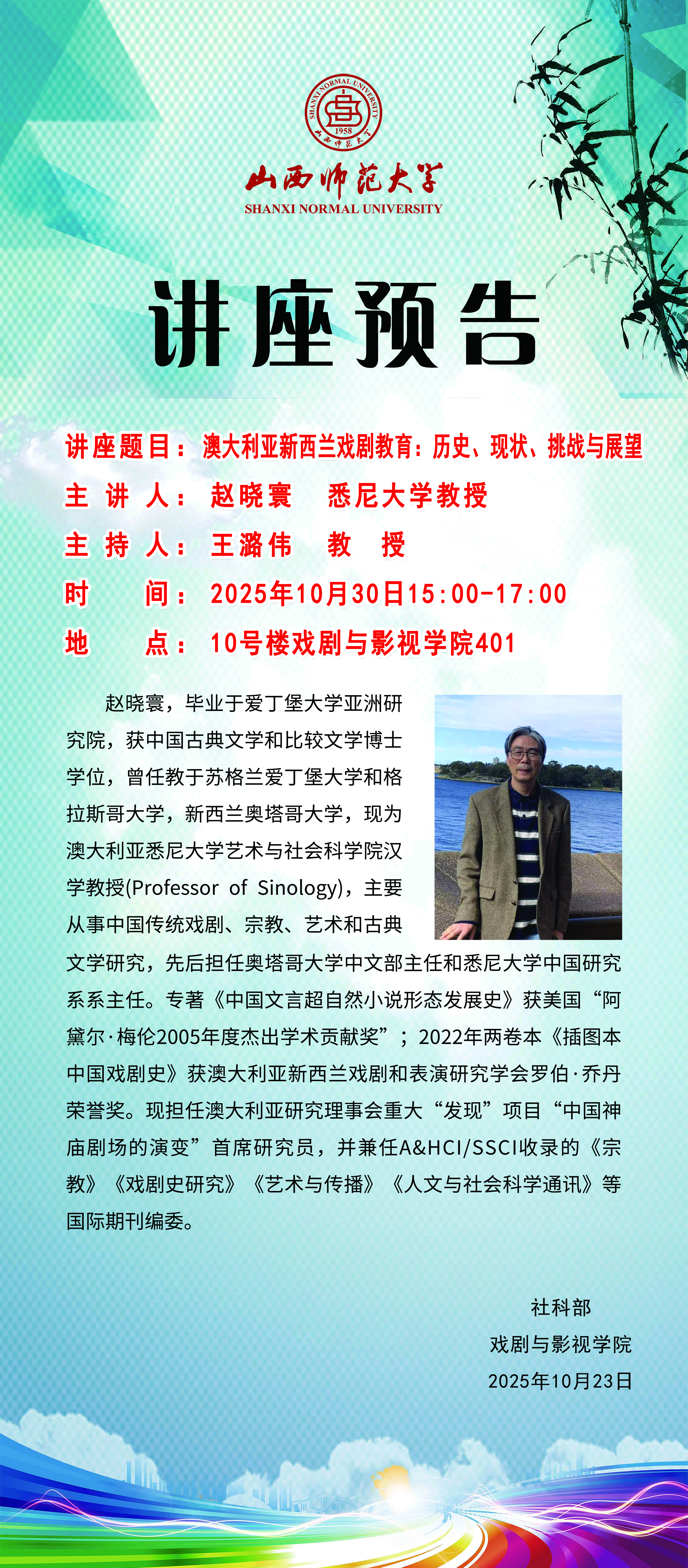 我院拟于10月30日(周四)下午15:00-17:00在南区10号楼401会议室举办《澳大利亚新西兰戏剧教育:历史、现状、挑战与展望》讲座,主讲人为赵晓寰教授,本次讲座由王潞伟教授主持。