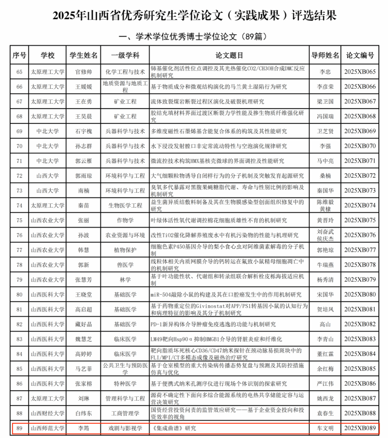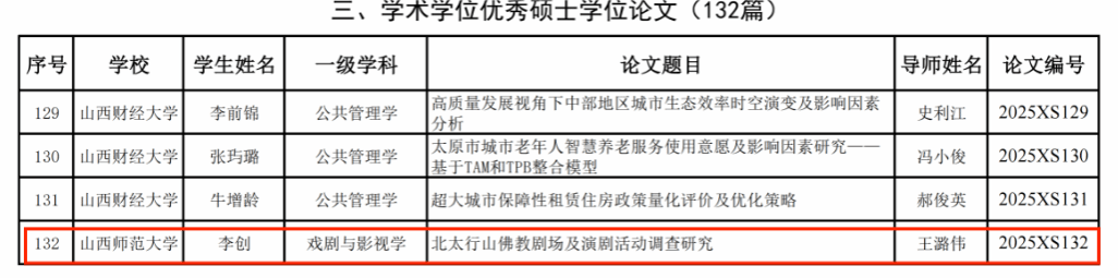 近日,2025年山西省优秀研究生学位论文(实践成果)评选结果公布。我院毕业生李筠的学位论文《<集成曲谱>研究》(车文明教授指导)获山西省优秀博士学位论文,毕业生李创的学位论文《北太行山佛教剧场及演剧活动调查研究》(王潞伟教授指导)获山西省优秀硕士学位论文。