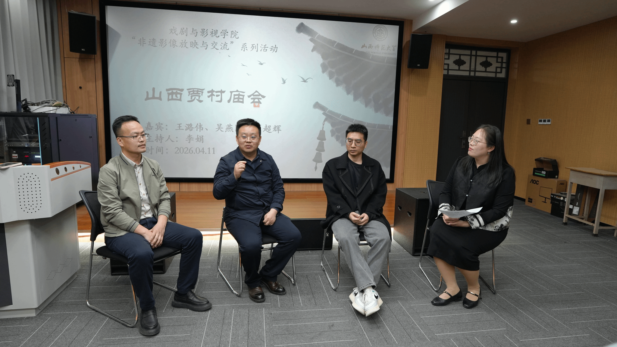 为弘扬中华优秀传统文化,深化师生对非物质文化遗产的认知,2026年4月11日,戏剧与影视学院在301视听室举办了“非遗影像放映与交流”系列活动的第一期——《山西贾村庙会》专题放映活动。本次活动由李娟老师主持,特邀王潞伟、吴燕国、简超辉三位嘉宾到场,吸引了众多师生参与,共同欣赏非遗影像,沉浸式感受民俗文化的独特魅力。
