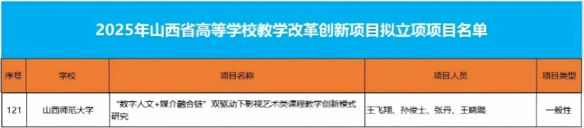 日前,2025年山西省高等学校教学改革创新项目拟立项项目名单公布,我院王飞翔老师团队申报的《“数字人文+媒介融合链”双驱动下影视艺术类课程教学创新模式研究》项目获批立项。