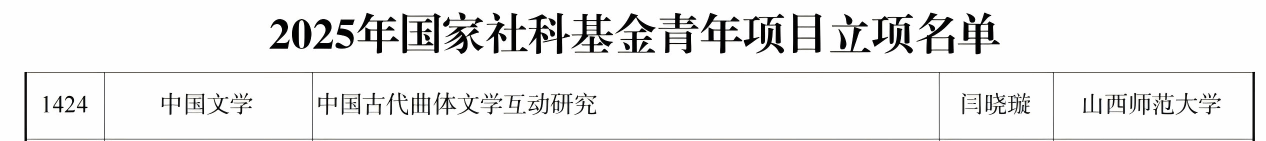 近日,2025年国家社科基金青年项目立项名单公布。我院闫晓璇老师申报的《中国古代曲体文学互动研究》项目获批立项。