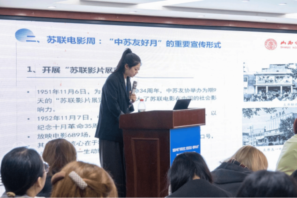 本次学术交流与研讨活动开设了“学者论坛”和“青苗论坛”。10月18日下午,学者们围绕“艺术与文化”“战争与和平”“历史与现实”等议题展开了主旨演讲与讨论。我院博士研究生宋瑷均应邀参会,并以《山西省中苏友好协会电影放映史考》为题作论文宣讲,提出1949年成立的中苏友好协会以巩固中苏关系为核心任务,在山西地区将电影与幻灯放映作为重要宣传手段,其通过多样化放映形式传播“中苏友好”观念,推动苏联经验本土化。论文的选题价值受到参会专家们的一致认可。
