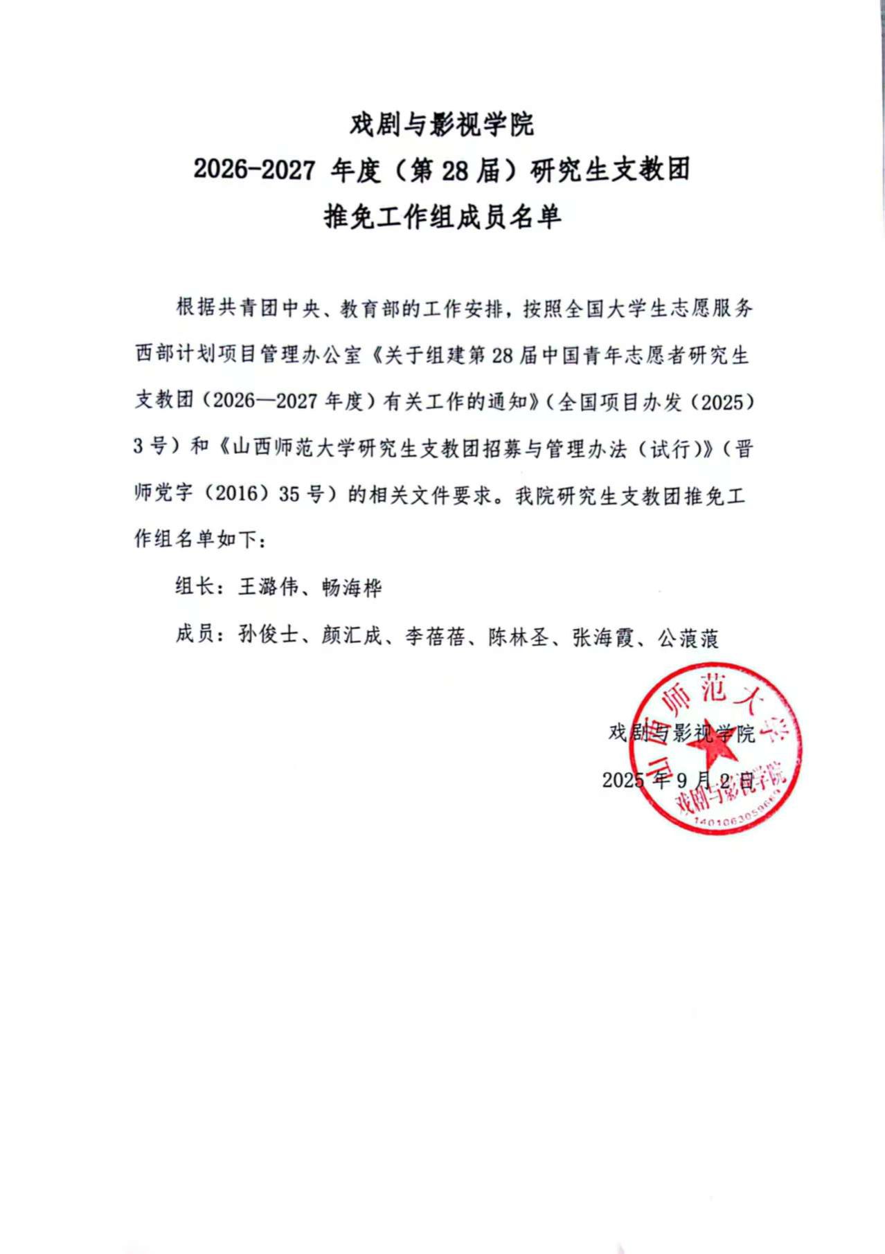 戏剧与影视学院2026-2027年度(第28届)研究生支教团推免工作组成员名单